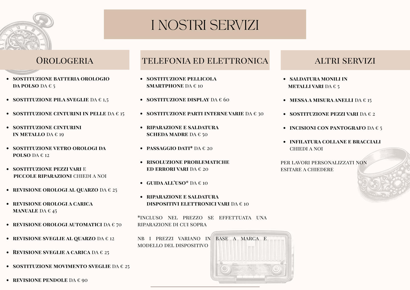 Servizi offerti• Riparazione e vendita al dettaglio di orologi da polso, parete, sveglie e pendole